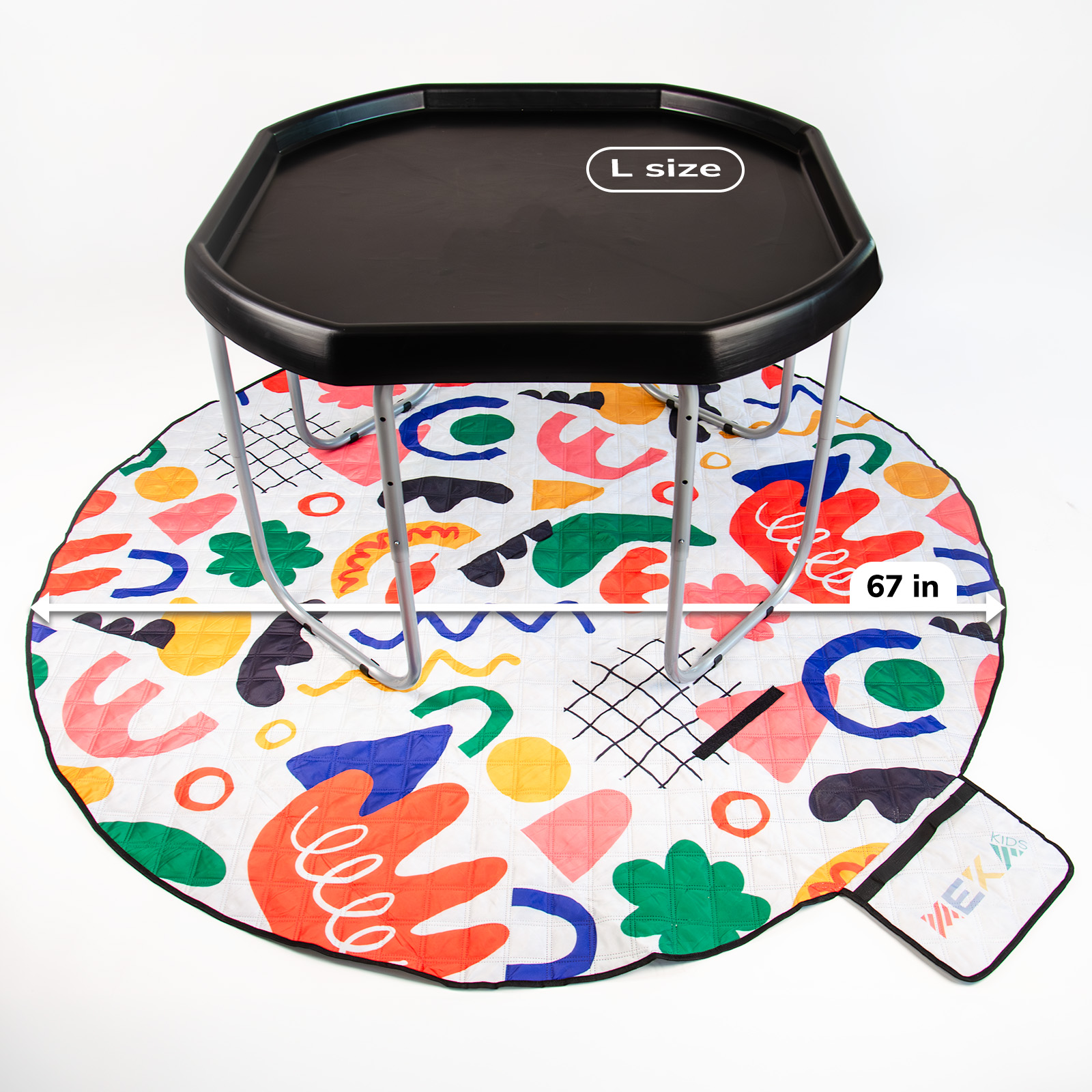 Generous 67in diameter size fits both small and large Tuff Trays and is ideal for outdoor adventures. Works beautifully for cozy indoor activities or energetic play outdoors.